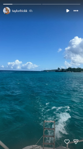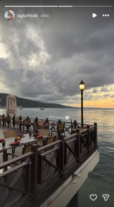On Wednesday, Taylor shared two snapshots, capturing the nature and surroundings. The first photo was a trail left by their boat while cruising through fresh waters. Mountains can be seen in the distance. The other snapshot was from Sandal’s Royal Caribbean resort, where the couple enjoyed the evening.