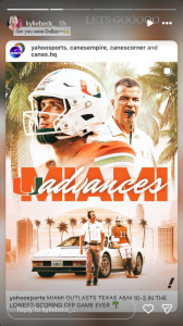 It’s a moment worth celebrating for the No. 10 seed Miami, and Beck’s sister, Kylie, is joining the party. She reposted a graphic originally shared by Yahoo Sports on Instagram, announcing the final results of the game, on her Instagram story.