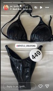 The suit is made by Krystle Creations, which appears to be a luxury competitor suit company that Jaclyn tagged in her Instagram story.