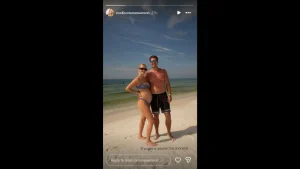 On Thursday, Madison and Erik Swanson enjoyed a sun-soaked beach day. Madison was in a chic blue and white striped bikini while the pitcher was in black swim shorts. The backdrop of the photo was the ocean. Madison added a playful caption to her Instagram story: