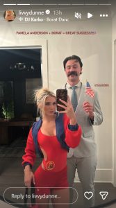 In an Instagram story posted by Dunne, the couple were seen posing for a mirror selfie in their outfits as Dunne was dressed up as Pamela Anderson, wearing a Baywatch red lifeguard swimsuit and jacket. Skenes, meanwhile, dressed as Sacha Baron Cohen’s Borat. He wore a grey suit, a mustache, and held a small American flag.