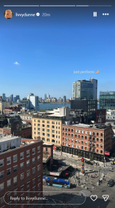 In a new Instagram Story, Dunne shared a sun-kissed selfie, wearing a vibrant blue bikini. The image shows her standing on a terrace with the city skyline and water in the background, her long blonde hair catching the sunlight.