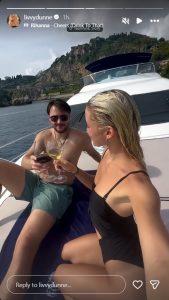 In one clip, she’s seen on a yacht enjoying a drink with Skenes, both relaxing under the Mediterranean sun. Dunne wore a sleek black swimsuit as she raised a glass, while Skenes sported sunglasses and swim trunks.