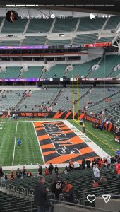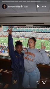 In one picture, Biles posed with a friend in the stands. Her friend was wearing a gray Bengals sweatshirt.