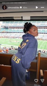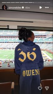 Biles documented the day on her Instagram Stories, featuring her custom gameday outfit. The pictures also highlighted a sweet moment with Owens on the field as the couple shared a kiss on the sidelines.