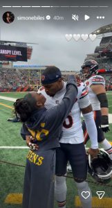The most heartwarming photos came after the game as Biles was on the sideline to greet her husband. She posted pictures of them embracing while Owens was still in his Bears Jersey as Biles had her arms wrapped around his neck.