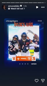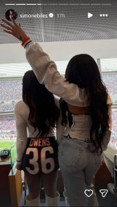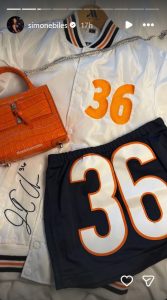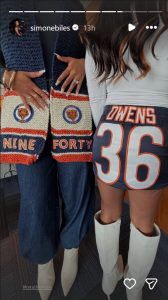 Biles shared multiple photos of her gameday fit on her Instagram stories, which included an up close shot of the full fit. In the pictures, she wore a white top and a navy blue skirt with Owens’ name and jersey number embroidered. There was also a picture of her in the stands rooting for the Bears from a suite with a friend.