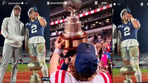 Dart posted a photo of himself in which he was holding the egg-shaped trophy, a picture that was taken last year after Ole Miss beat the Bulldogs in a 24-14 matchup.