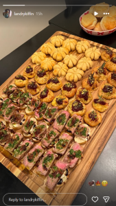On Thursday, Landry showed an impressive Thanksgiving spread laid out on her Instagram stories. The platter featured an assortment of bite-sized appetizers, including mini dinner rolls shaped like pumpkins, golden toasted bites topped with cranberry glaze, and savory beef crostinis layered with herbs and caramelized onions. A bowl of fluffy biscuits was on the side.