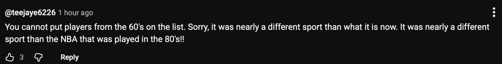 “You cannot put players from the 60’s on the list. Sorry, it was nearly a different sport than what it is now. It was nearly a different sport than the NBA that was played in the 80s,” one fan explained.