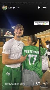 Perhaps the ultimate “couple goals” moment came when Clark posted a photo from a game where she is wearing a custom green Mean Green jersey. On the back, it reads “MESTEMAKER” with his number, 17. She points to the name with a proud smile as he looks on. Her caption for this photo was, “I’m ur biggest fan.”