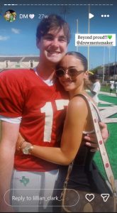 In a picture taken 27 weeks ago, Lillian is hugging Mestemaker on the sidelines of a football field. He is seen wearing his red No. 17 practice jersey and she has her arms wrapped around him. She captioned the post “Beyond proud!!! @drewmestemaker.”