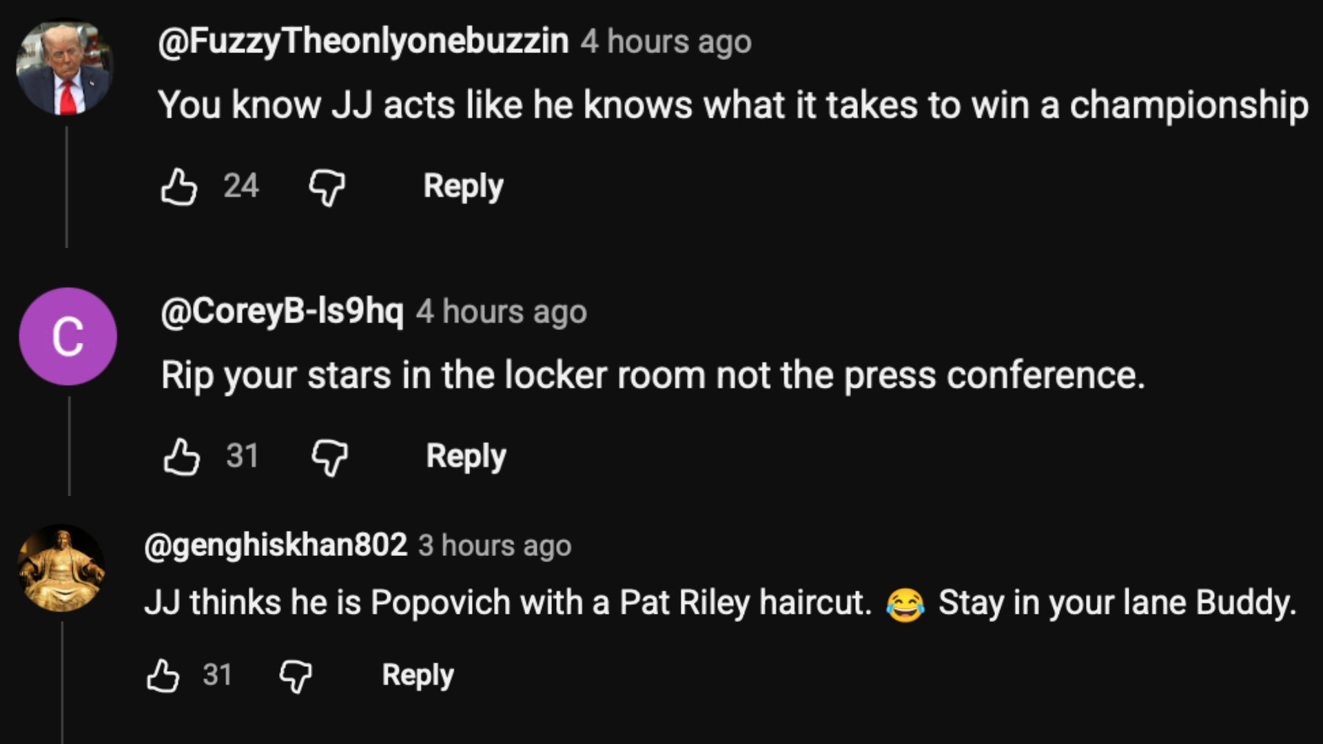 “JJ thinks he is Popovich with a Pat Riley haircut. Stay in your lane Buddy,” another sounded off on JJ Redick.