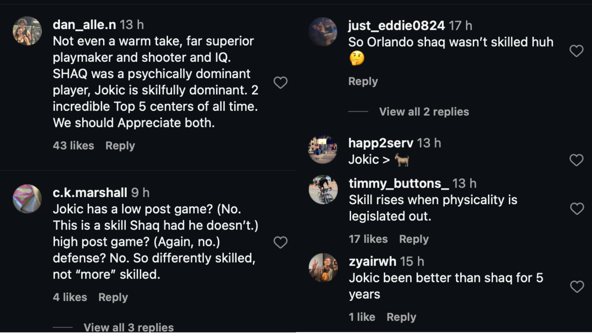 “Jokic been better than Shaq for 5 years,” another adjudged.