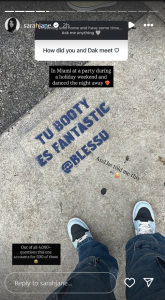 On Wednesday, Sarah was traveling back home alone and had some time to interact with her followers on Instagram. One common question that she was asked was on how she and the Cowboys quarterback met. She said: