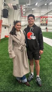 Dillon Gabriel in the story donned a black Cleveland Browns hoodie, pairing it with black shorts and a black pair of shoes, while his fiancée wore a beige sweater-type trench coat for the picture.