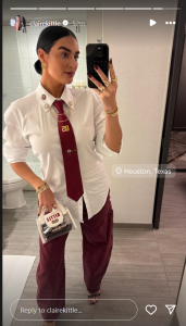 On Sunday, hours before the kickoff, Claire revealed the outfit she was going to wear for Sunday’s game. In the mirror selfie she posted, Claire was wearing a a crisp white button-down shirt paired with deep red pants. She complemented the outfit with a matching burgundy tie with “85” — George Kittle’s jersey number — written on it.