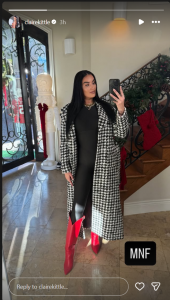 San Francisco 49ers tight end George Kittle’s wife, Claire, dressed up to attend the game against the Carolina Panthers at Levi’s Stadium. She posted a mirror selfie, showing her outfit, featuring all-red leather boots for Monday Night Football.