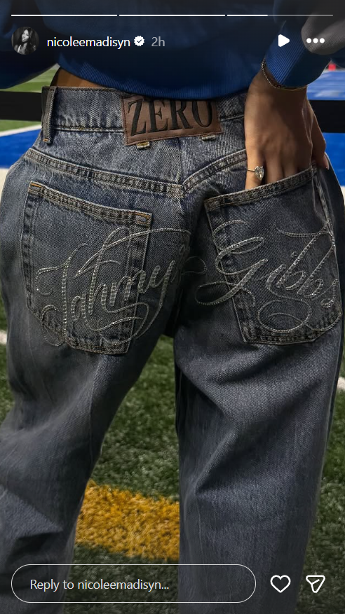 As the Lions took on the Minnesota Vikings today, Nicole made headlines herself with a stylish gesture that quickly went viral among fans. She arrived at Ford Field wearing a pair of custom jeans featuring Gibbs’ name engraved across the back of her jeans. She shared a photo of her look on her Instagram story ahead of kickoff.
