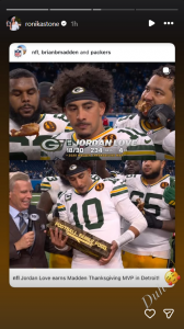 After the NFL announced his MVP honor, Love’s wife, Ronika Stone, celebrated the moment on social media. She reposted the league’s graphic revealing his award and added a single-word reaction that captured her excitement.