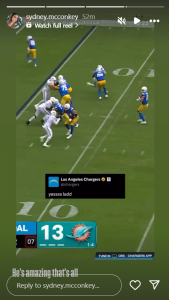 LA Chargers wide receiver Ladd McConkey’s wife, Sydney, enjoyed the game against the Miami Dolphins on Sunday. She was proud after her husband caught a touchdown pass from quarterback Justin Herbert in the third quarter, as the Chargers won 29-27.