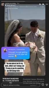 However, his wife sometimes needs to deal with getting hate online. On Thursday, she posted on her Instagram story, acknowledging a hateful comment she received on her wedding Instagram post.