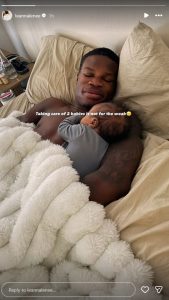 On Thursday, Travis Hunter’s wife, Leanna, posted a photo of Hunter lying in bed with their child. She included a playful comment about needing to take care of two babies.