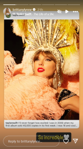 Brittany reshared Swift’s celebratory Instagram post and left a two-word comment in admiration:
