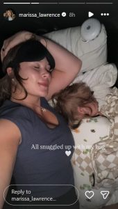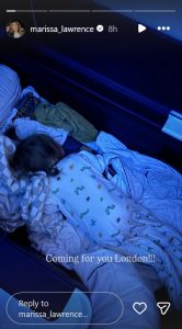Marissa posted a number of Instagram stories. One was an image of little Shae Lynn sleeping on the plane, captioned “Coming for you London!!” Another picture was of Marissa and Shae cuddled up together. The next story was captioned with “All snuggled up with my Bug 🤍.”