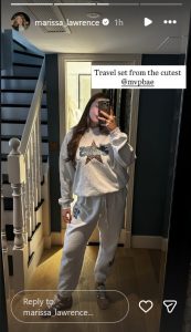 In the following stories, Marissa posted a mirror selfie of herself in a cozy travel sweatsuit, as they traveled to London to see Trevor Lawrence and the Jaguars play.