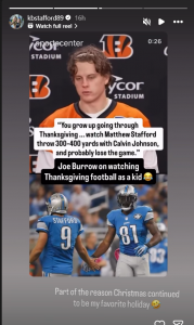 While talking to reporters ahead of his Thanksgiving game, Burrow went down memory lane and shared what it was like to watch Stafford and the Lions on Thanksgiving Day.