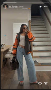 Caswell will be wearing a special outfit for the occasion. On Sunday, hours before the kickoff, she posed in front of a mirror, wearing Cleveland’s signature colors. She donned white fitted tank top, light-wash wide-leg jeans, and an oversized brown-and-orange varsity jacket. She complemented the outfit with trendy sneakers, a brown leather belt, and a large matching tote bag.