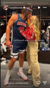 Camille Kostek and Rob Gronkowski continue to share their fun relationship with their followers. The model and TV host gave a glimpse into their relationship by sharing a personal photo of the couple, while visiting the University of Arizona, where he attended college. Kostek posted the romantic photo of Gronkowski on Instagram Stories and captioned it “hard launch with rocky gronkstone”.