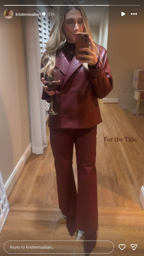 She wore an all-crimson outfit, complete with a crimson coat with a crimson sweater underneath, along with some crimson pants and a pair of crimson shoes. She was doing this while doing a mirror selfie and enjoying some wine.