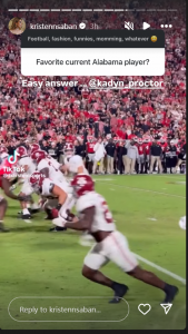 On Wednesday, Kristen conducted a Q&A with fans on Instagram. One fan asked who is her current favorite favorite Alabama player and Kristen replied: