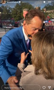During a college game day appearance with his wife, Miss Terry, last month in Georgia, Kristen shared a heartwarming visual of Coach Saban and his wife. Miss Terry was seen helping Nick by fixing his tie ahead of the gameday broadcast.