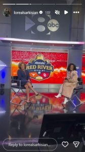 The pictures showcase her entering the ABC studio, which was presumably for a fun media segment before the game. One of her images even showed her on set with the iconic Allstate Red River Rivalry logo displayed prominently in the background.