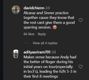 “Alcaraz and Sinner practice together cause they know that the rest cant give them a good sparring session. 😂” one fan wrote.