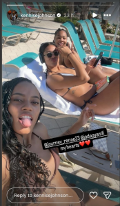 On Thursday, Johnson dropped photos from their ongoing vacation, where she captures a poolside selfie with Gyamfi and Houston relaxing on a lounge chair and soaking up the sun. Gyamfi was wearing a stylish all-white bikini paired with sunglasses and headphones. Her other two friends were flashing peace signs and sticking out their tongues for the selfie.