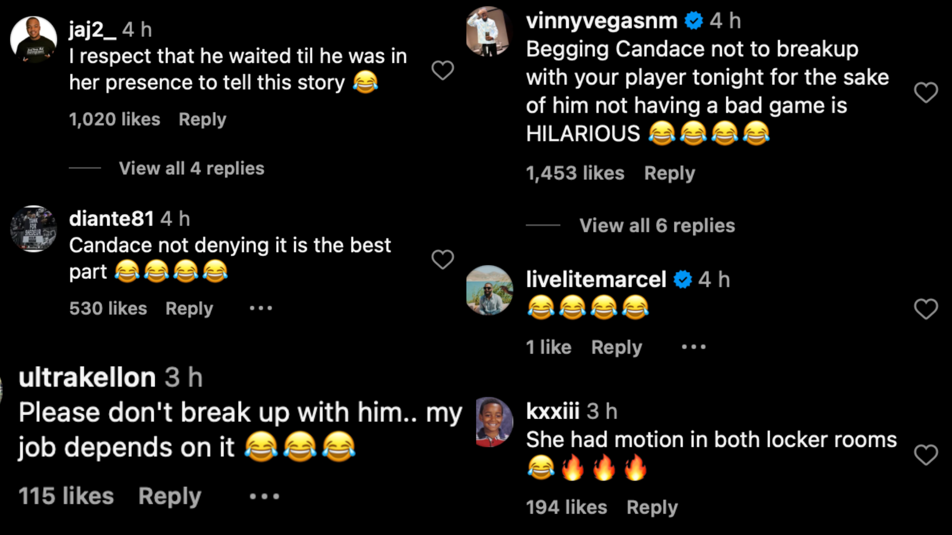 “Begging Candace not to breakup with your player tonight for the sake of him not having a bad game is HILARIOUS,” one fan laughed.