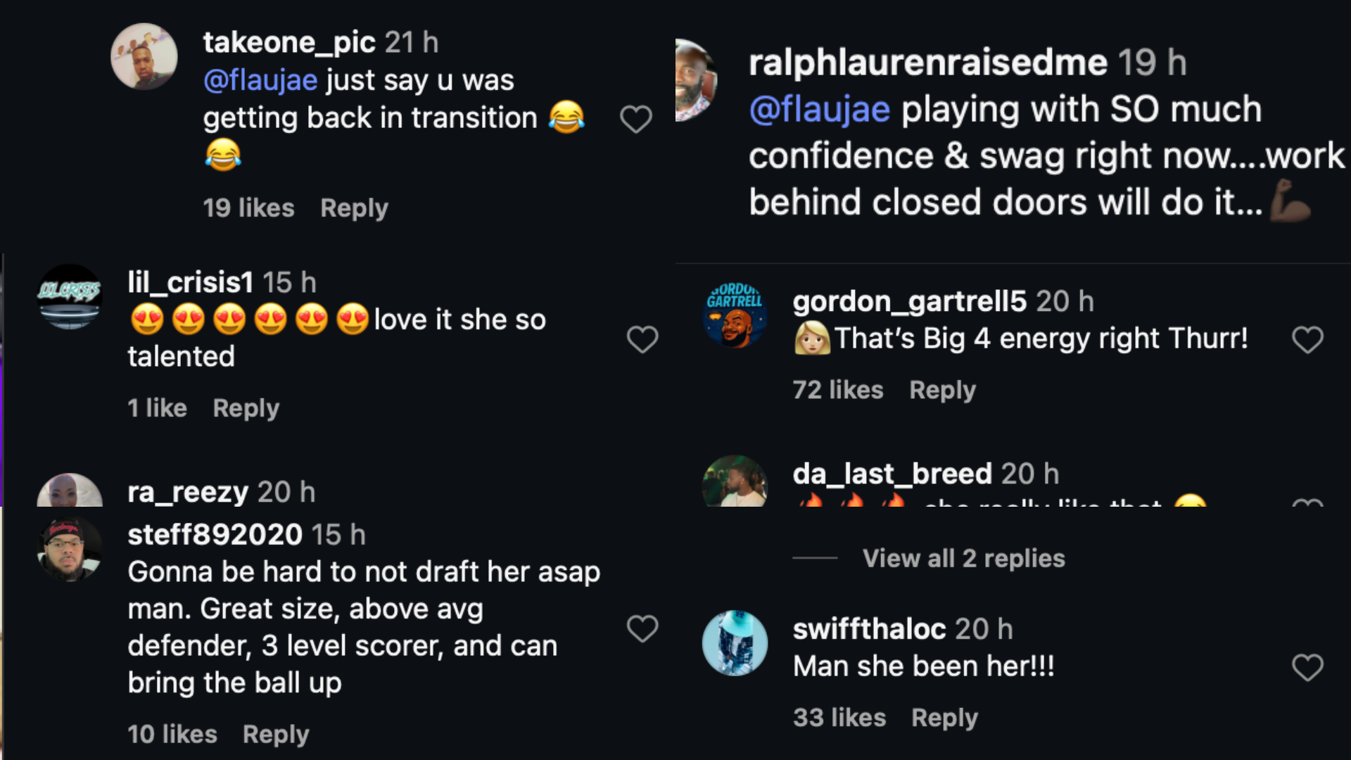 “Playing with SO much confidence & swag right now….work behind closed doors will do it…,” another appreciated Flau’jae.