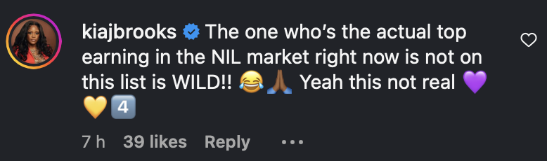She commented, “The one who’s the actual top earning in the NIL market right now is not on this list is WILD!! Yeah this not real,” showing support for her daughter and disbelief about the exclusion.