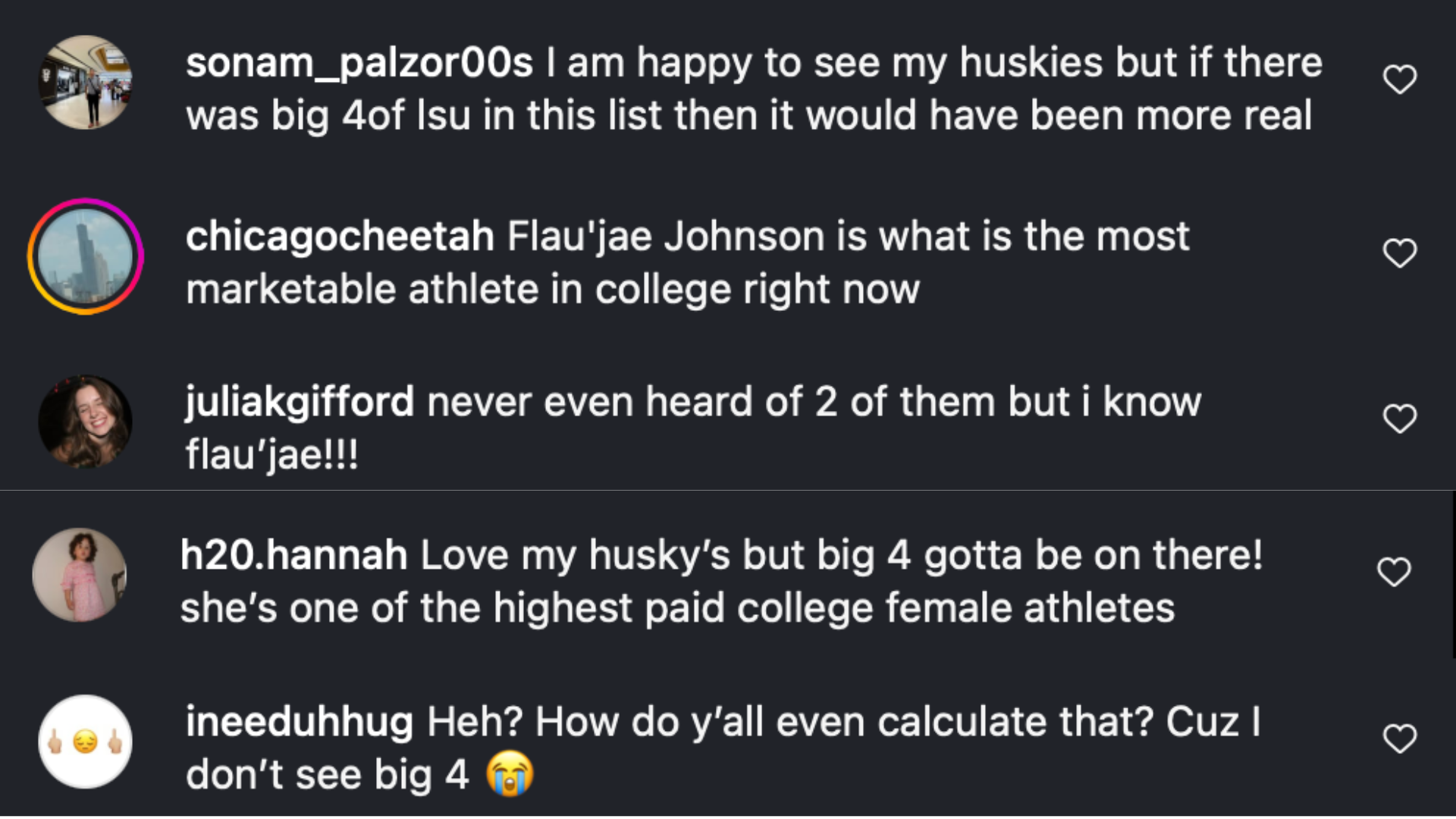 “Love my husky’s but big 4 [Flau’jae Johnson] gotta be on there! she’s one of the highest paid college female athletes,” one fan commented about LSU star’s exclusion.