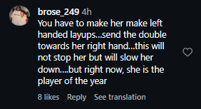 “You have to make her make left handed layups…send the double towards her right hand…this will not stop her but will slow her down….but right now, she is the player of the year,” explained one fan.