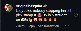 “Lady Jokic nobody stopping her #1 pick stamp It 😂 35 in 5 straight on 60% fg 😮😍🔥🔥🔥,” joked another fan.
