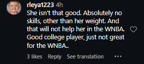 “She isn’t that good. Absolutely no skills, other than her weight. And that will not help her in the WNBA. Good college player, just not great for the WNBA,” explained one fan.