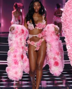 The 23-year-old celebrated the achievement on social media by posting a photograph of herself walking the ramp in her lingerie, adorned with flowers in a primarily light pink and white set, as well as sculpted roses on her side.